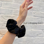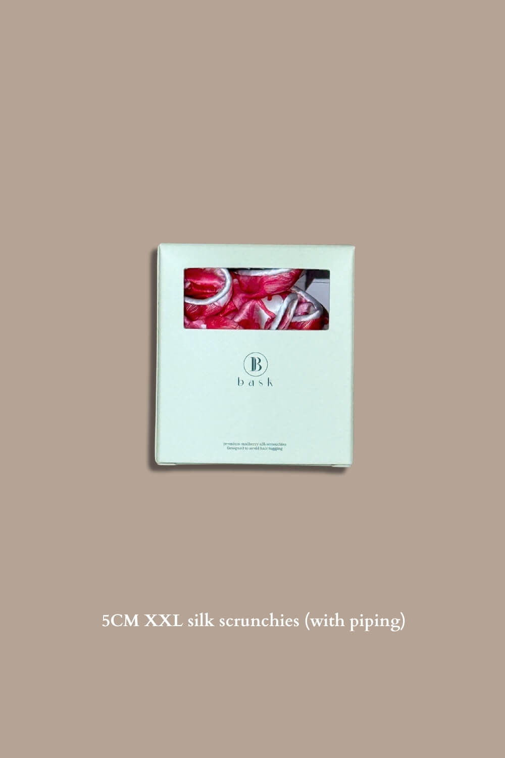 These silk scrunchies are made of ultra shiny 22 momme mulberry silk fabric with contrast satin piping.